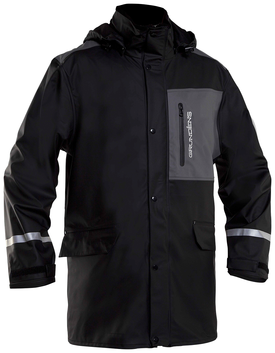 Sunnan 307 Jacka med avtagbar-, reglerbar huva. Dragkedja med stormklaff. Ok i ryggen för ventilation, manchesterfodrad krage, framfickor, bröstficka med dragkedja, reflex runt ärm samt reglerbart ärmslut. Rygglängd 92 cm i storlek Large. Sunnan 205 Byxa med resår och snörning i midjan, reflex samt reglerbart benslut.?Material: PU belagd polyester. Vikt: 190 g/m².Överensstämmer med EN 343.