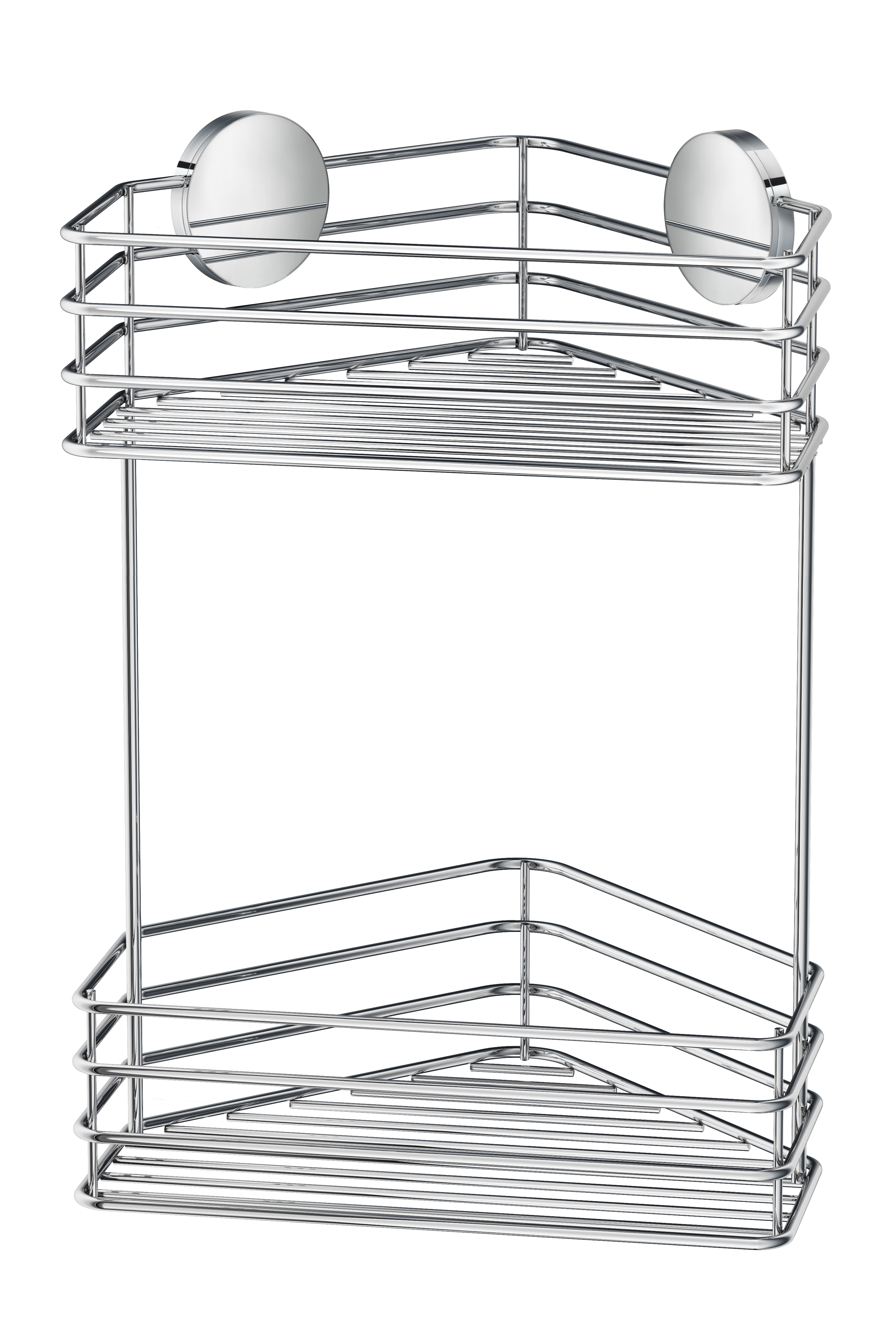 Dubbel hörnduschkorg.Kromat rostfritt stål.Längd 250 mm. Höjd 320 mm. Djup 200 mm.Hållare diam 60 mm.