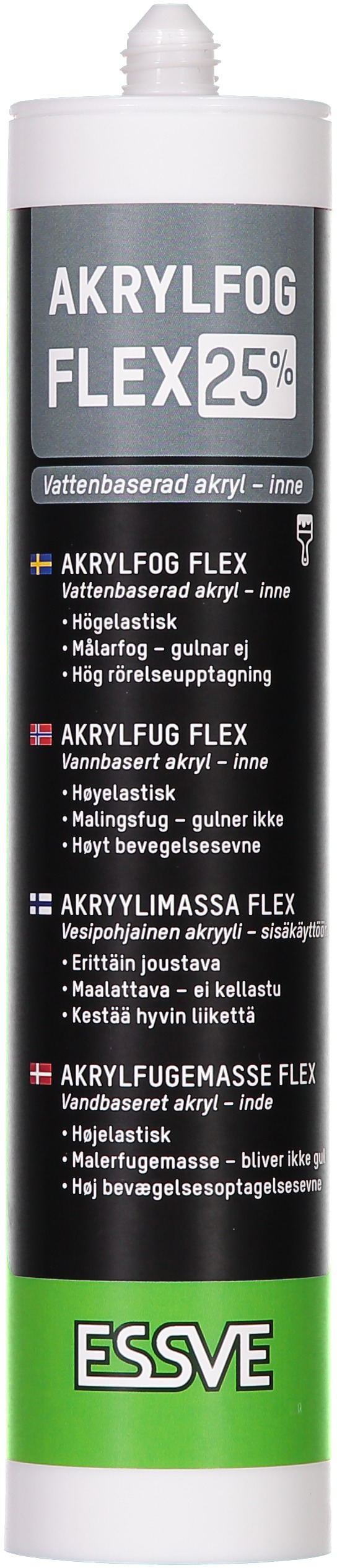 Högelastisk akrylfogmassa för interiöra fogar med krav på hög rörelseupptagning. Bör användas i torra frostfria inomhusmiljöer, men kan appliceras utomhus frostfritt och regnskyddad de första 60 min efter applicering. Tål lagring i köldgrader kortare tid ned till -10C°. Lättarbetad, vattenlöslig innan härdning. Rengör spill med vatten/fuktad trasa. Väderbeständig