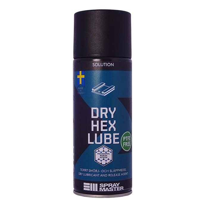 Spray Master Dry Hex Lube är ett snabbtorkande släpp- och antifriktionsmedel som har en god vidhäftningsförmåga och ger en torr glidyta på de flesta material såsom plast, textil, gummi, trä, metall och glas. Dry Hex Lube ger en tunn delvis transparent film av hexagonal bornitrid med lång livslängd även u nder höga tryck.
