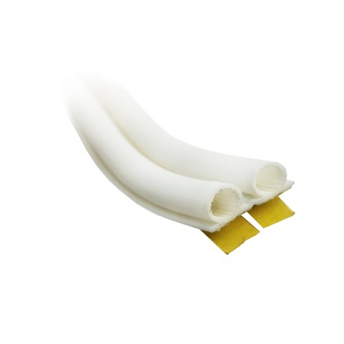 7 mm självhäftande tätningslist i omegaprofil av vit silikon. Passar till springor mellan 2-6 mm. Levereras dubbelsprutad. Delas vid montering. OBS! Tejpens vidhäftning är vanligtvis mycket bra på målade träytor, men kan variera på pulverlackade metallytor. Vid osäkerhet gör egna prov. Bästa silikonkvalitet för minst 10 års funktion. Listen är stadig att arbeta med, men ändå elastisk och följsam. Invändigt talkad för att inte klibba ihop.