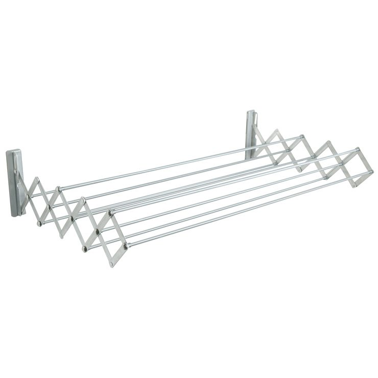 Vägghängd torkställning RuckZuck från österrikiska JUWEL. Monteras med skruv på väggen och dras ut som ett dragspel vid användning och fälls enkelt ihop igen när den inte behövs. 7 linor.