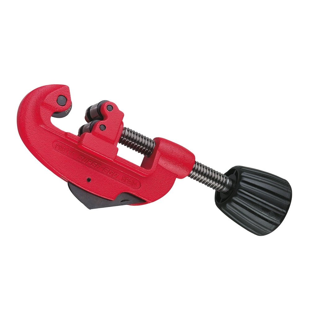 Super Ego röravskärare 725 Pro Standard för rördiameter 1/8" - 1.1/8" / 3 - 30 mm. Zamak legerad kropp med monoglidblock och infällbar renskniv. Rullarna har infrästa spår som möjliggör kapning även nära kanten. Extra stor räfflad matarskruv för snabb justering innehållande 1 x extra trissa. SB-packad.