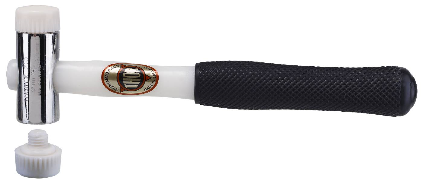 Typ Thorex Nylon. Nylonhammare. Med utbytbara nylonslag. Vita. (Slagen har gängad tapp.) Slaghuvudet av stål. Nr 708N och 720N med hickoryskaft. Övriga med nylonskaft och gummihandtag.