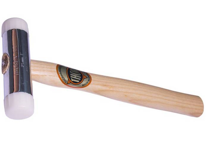Typ Thorex Nylon. Nylonhammare. Med utbytbara nylonslag. Vita. (Slagen har gängad tapp.) Slaghuvudet av stål. Nr 708N och 720N med hickoryskaft. Övriga med nylonskaft och gummihandtag.