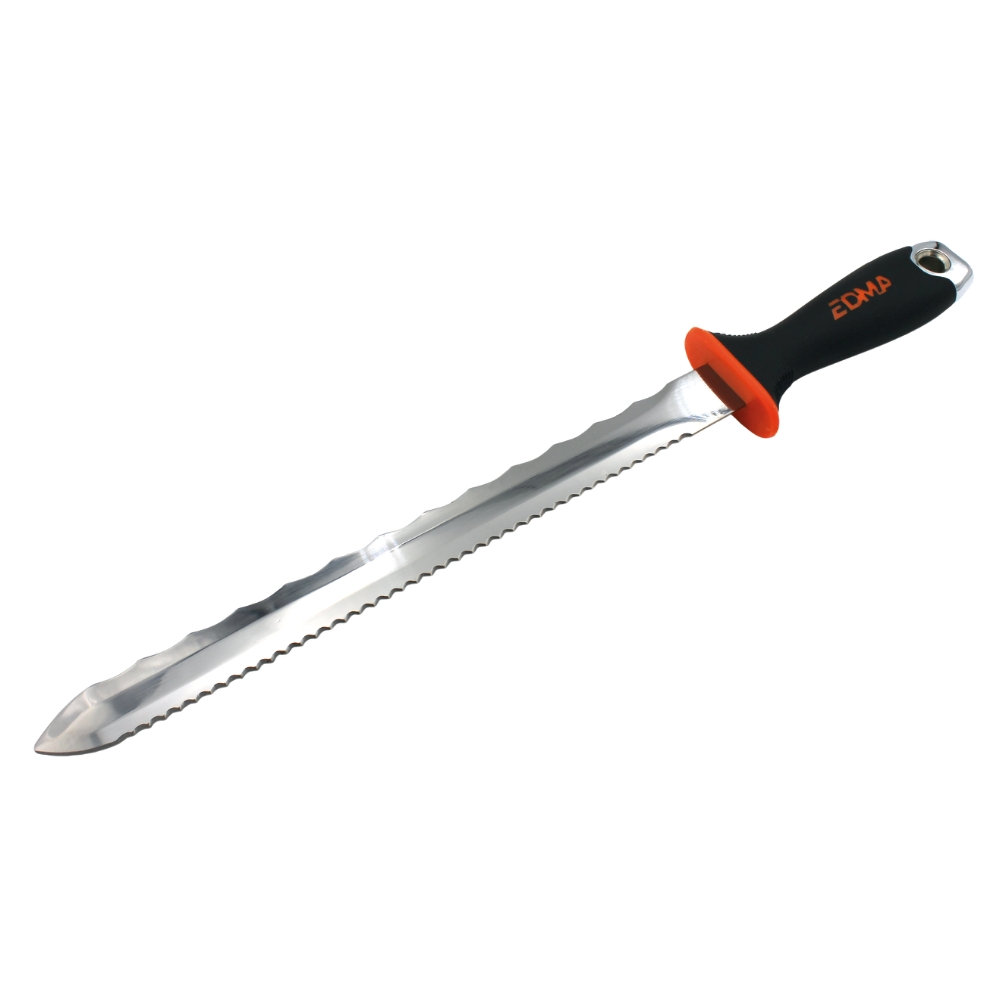 Edma isoleringskniv är dubbeleggad med blad av polerat rostfritt stål där båda sidorna har dubbelslipad vågtandning - en med större vågor och en med mindre. Den olika tandningen gör att kniven lämpar sig att skära all typ av isolering med, även dukbelagd. Den slipade pilformade spetsen gör den även lätt att börja inne i isoleringen med. Greppvänligt skönt gummerat handtag med 25 mm brett blad av polerat rostfritt stål med dubbelslipade vågtandade dubbeleggar. Kniven levereras och förvaras i hölster av nylon som även går att hänga i bältet.