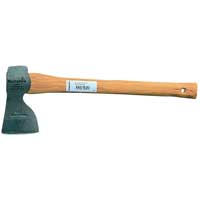 Blästrat och klarlackat smide med urtag i skallen vid skaftet, för att handen ska kunna hållas rakt över eggen vid skärande arbeten. Rakt skaft av hickory.