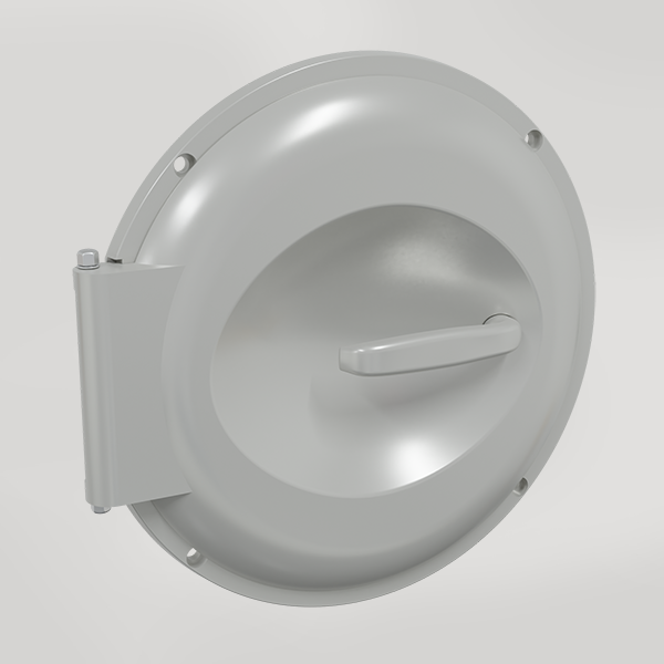 Rund inkastlucka handtag av lackad aluminium (ljusgrå).