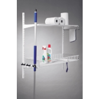 Komplett städset innehållande åtta delar. Innehåller 2 st väggskenor, 4 st konsoller, 1 st trådhylla, 1 st trådkorg, 2 st avdelare, 1 st hållare för trasor, 1 st handdukshängare, 1 st borsthållare.