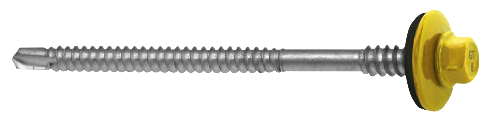 Självgängande (dubbelgängade) borrskruvar av ythärdat kolstål, med borrspets. Extra fingängade med sexkanthuvud, monterad bricka och vulkaniserat EPDM-gummi. Extra korrosionsskydd med skikt av typen greycoat.