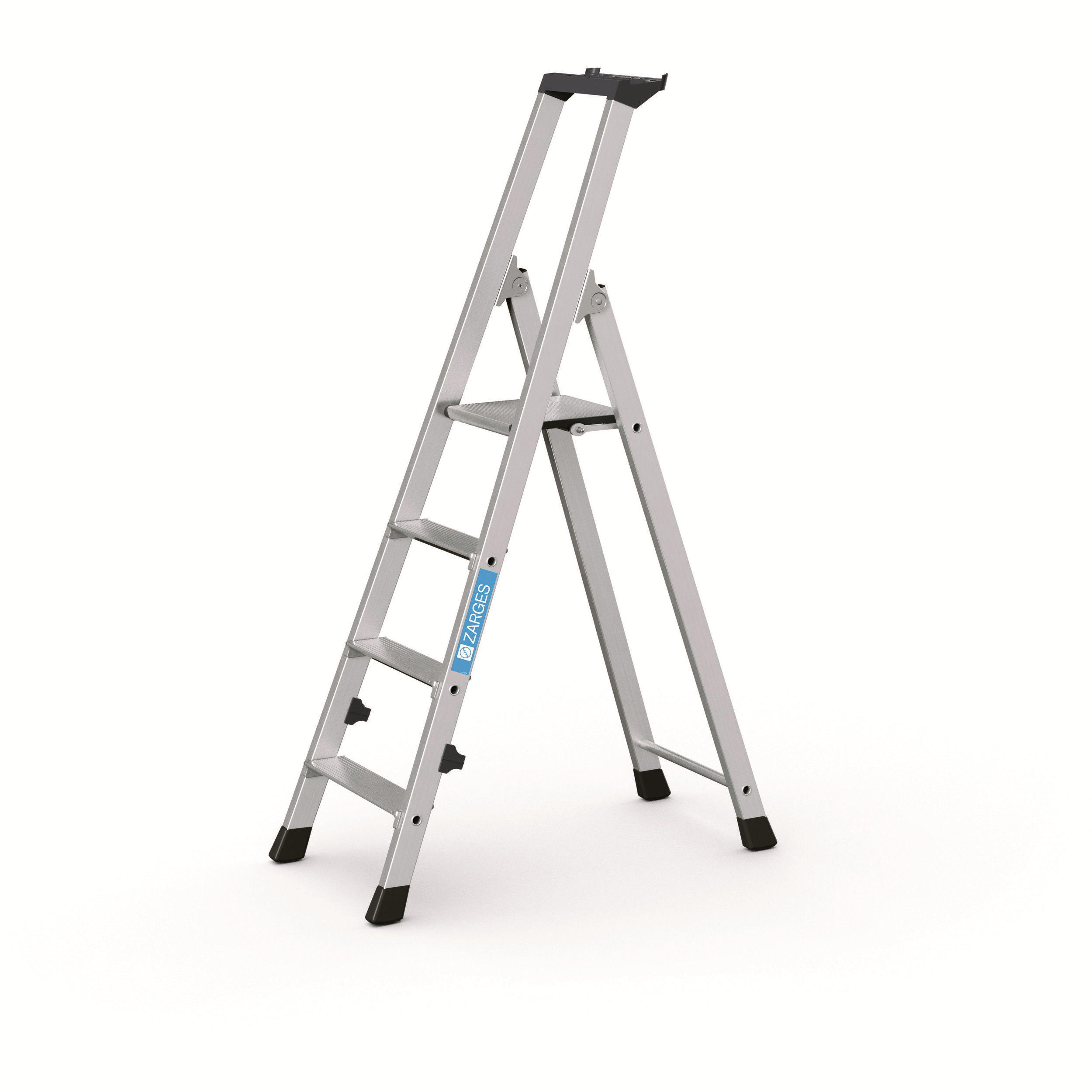Bekväm trappstege med 80 mm djupa steg och rymlig arbetsplattform med skyddsräcke för säkert arbete. Praktisk verktygshylla med gott om plats för handverktyg och småsaker. Patenterad stegkonstruktion: robust, stabil och hållbar flänsad förbindning mellan trappsteg och stegsidor. Plattform av strängpressad aluminium garanterar optimal stabilitet. Två beslag på plattformen av strängpressad aluminiumprofil låser stegen i utfällt läge. Halksäkra syntetiska glidskydd. I enlighet med SS-EN 131 professionell.