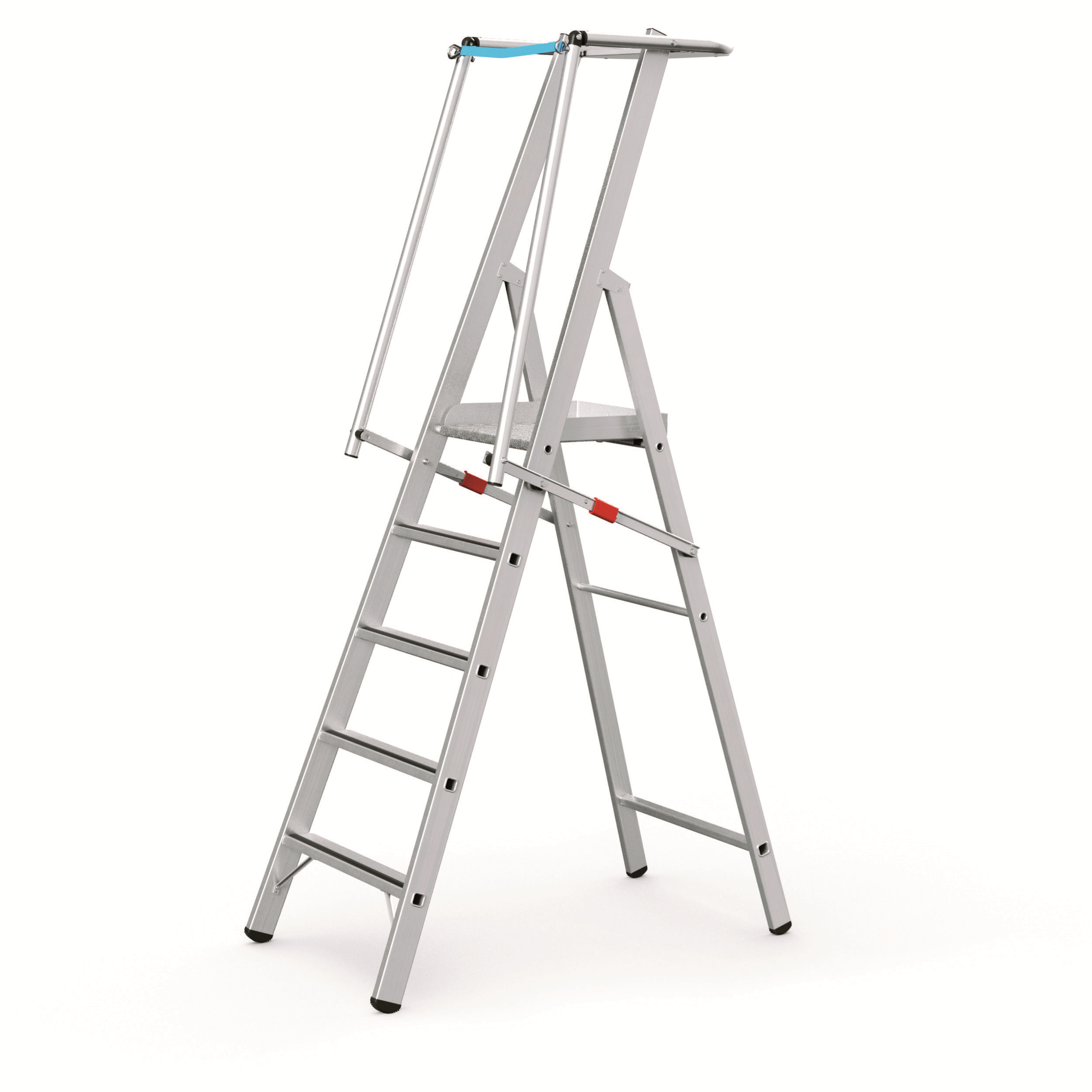 Arbetsplattform med 1 m högt skyddsräcke, stor arbetsplattform (400 x 400 mm) och 80 mm djupa steg med integrerat ZARGES Safer Step Technology halkskydd för maximal arbetssäkerhet. Eloxerade handledare och skyddsräcke svärtar inte dina händer. Stor hylla för verktyg och små delar. Optimal stabilitet tack vare dubbelsidigt, fast stag. Godkänd enligt Bra Arbetsmiljöval.