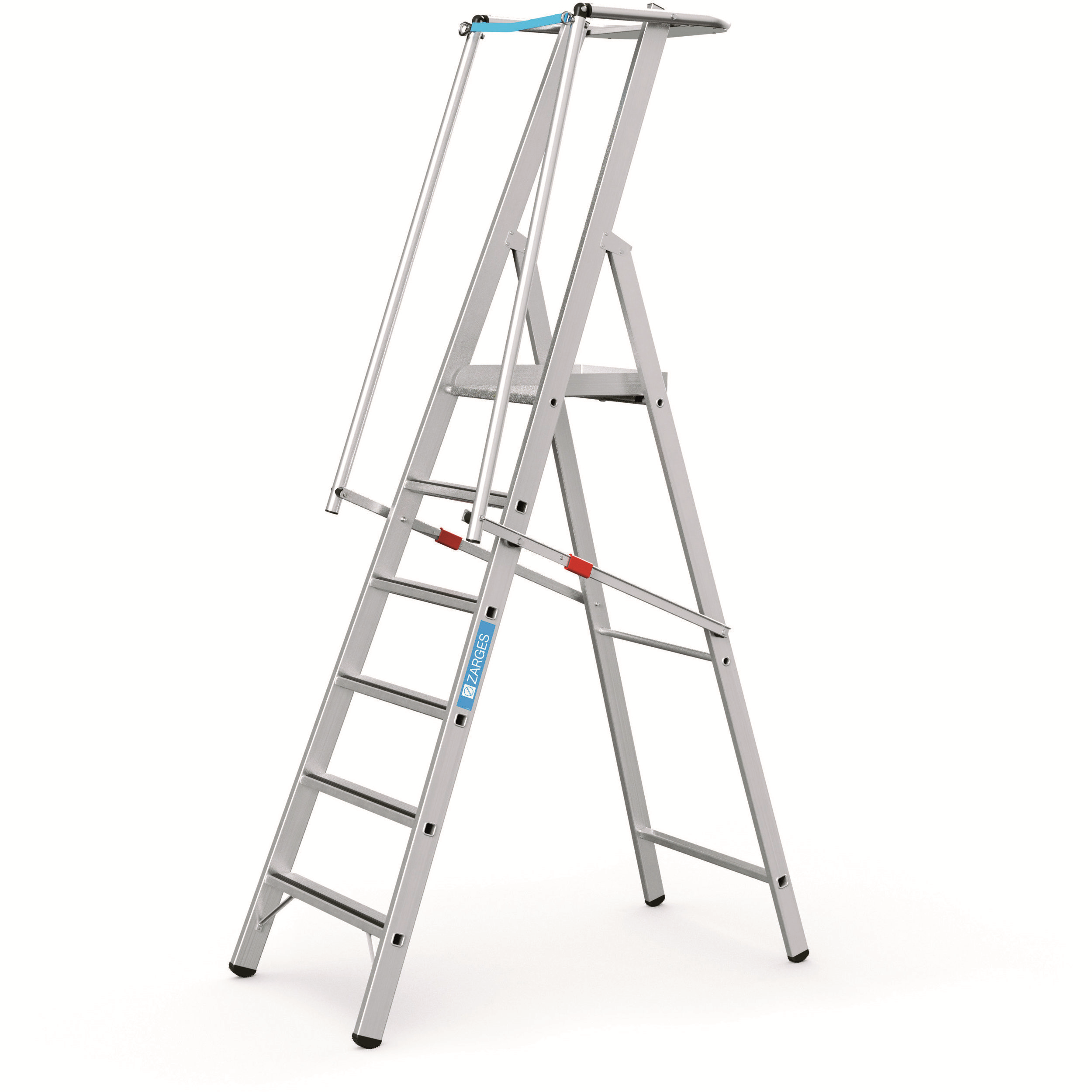 Arbetsplattform med 1 m högt skyddsräcke, stor arbetsplattform (400 x 400 mm) och 80 mm djupa steg med integrerat ZARGES Safer Step Technology halkskydd för maximal arbetssäkerhet. Eloxerade handledare och skyddsräcke svärtar inte dina händer. Stor hylla för verktyg och små delar. Optimal stabilitet tack vare dubbelsidigt, fast stag. Godkänd enligt Bra Arbetsmiljöval.
