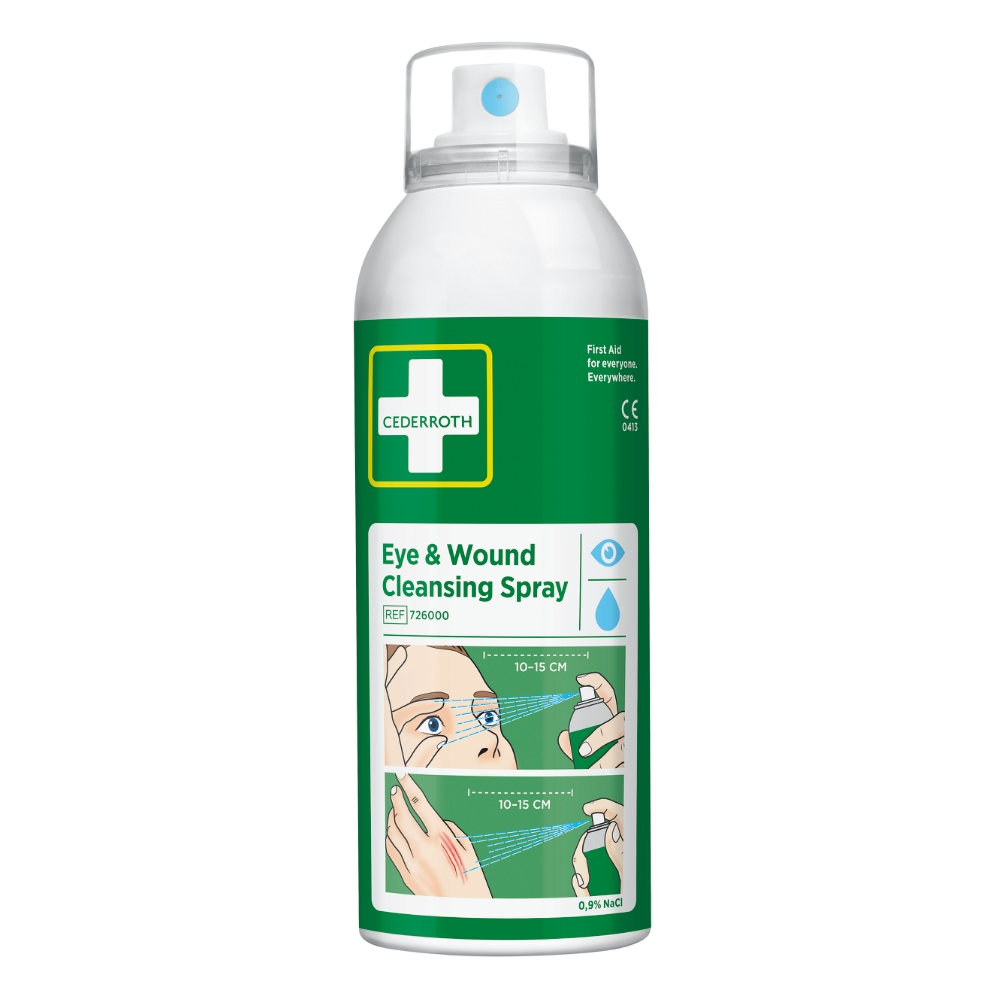 Spray för att rengöra och skölja bort damm och smuts ur ögon och sår. Spraya med ett avstånd på 10-15 cm. Sprayen ger ett mjukt vätskeflöde och har en total spoltid på 5 minuter, praktiskt för tex skrubbsår som behöver rengöras ordentligt. Sprayen kan användas flera gånger och är steril till sista droppen. Flaskans konstruktion gör att den kan användas upp och nervänd. Innehåller 150 ml steril koksaltlösning, 0,9% NaCl. Miljövänlig drivgas. Rengör munstycket före användning genom att spraya kort i luften.