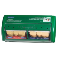 Med transparent lucka som skyddar mot damm och fukt. Plåstren dras nedåt för att undvika att smutsa eller blöda ner övriga plåster. Innehåller: 40 st Textilplåster (6444), 45 Plastplåster (6036) och 1 st nyckel.