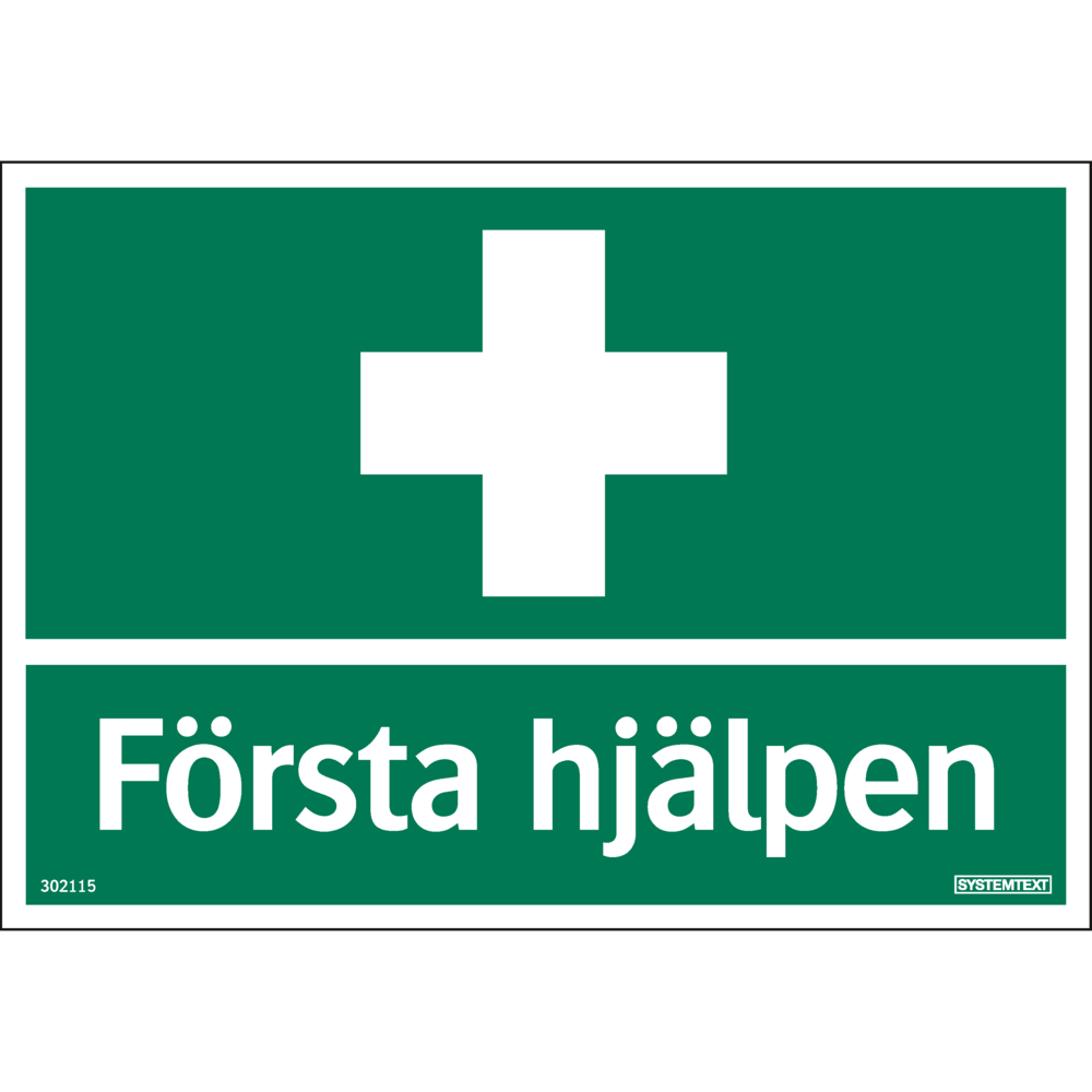 Plastskylt med ett vitt kryss på grön bakgrund, med vit text "Första Hjälpten". Storlek 210x148 mm. Fästes förslagvis med självhäftande tejpkuddar.