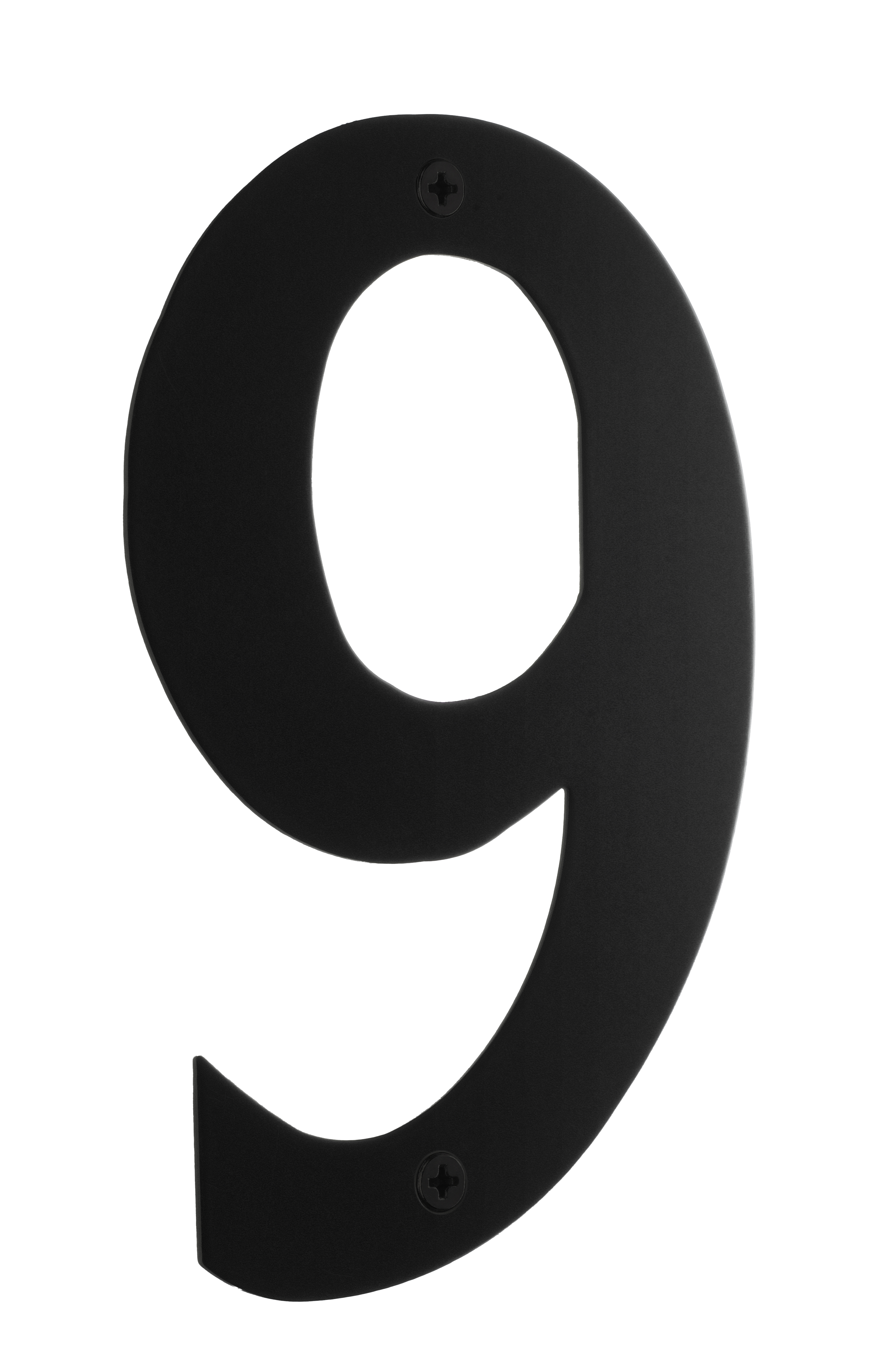 Rostfri hussiffra.Svart.Siffra 9.Höjd 150 mm.Komplett med skruvar, distanshylsor och pluggar.