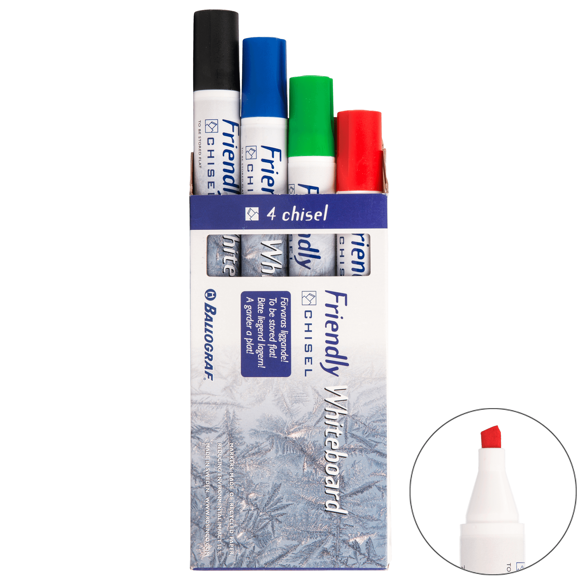 *Set med whiteboardpennor med snedskuren spets i serien Ballograf Friendly. Med snabbtorkande färg som är lätt att avlägsna. Pennkroppen är tillverkad av återvunnet papper vilket minskar miljöpåverkan med 50%.