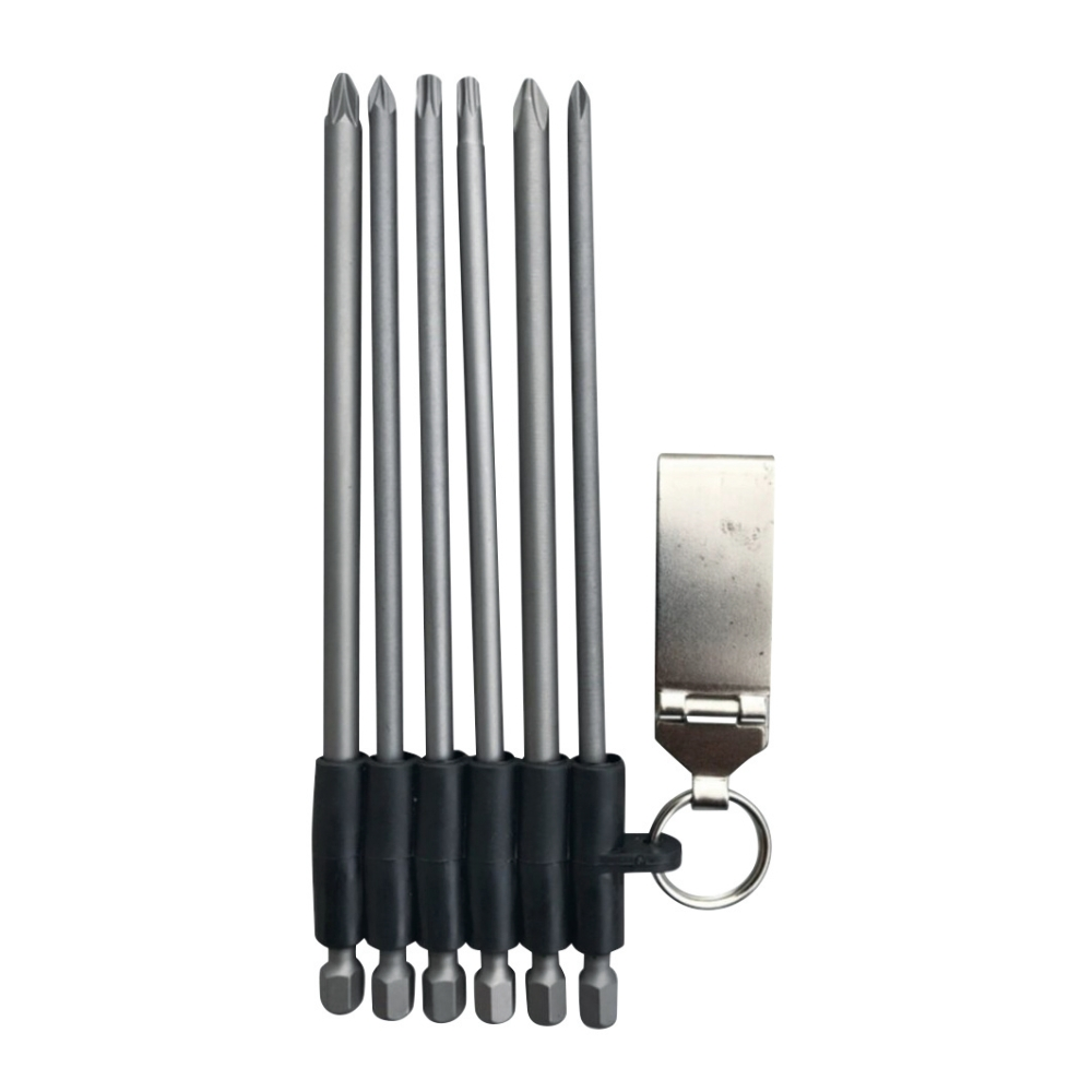 Bitssats innehållande 6 st 150 mm långa PH, PZ och Torxbits med 1/4" maskinfäste i amerikanskt S2 stål som sitter säkert i hållare av mjukgummi med bältesclip i metall.