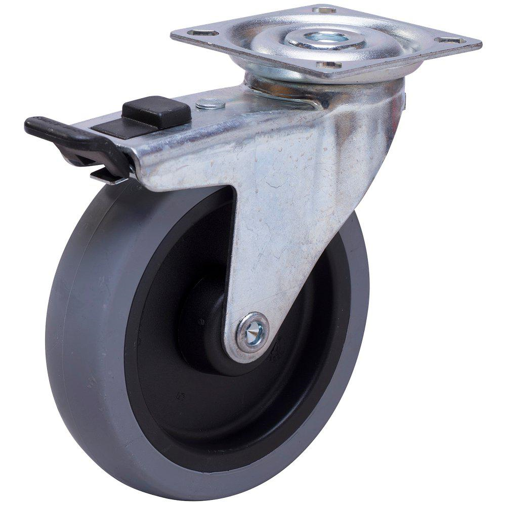 Apparathjul med pressad förzinkad plåtbygel och fästplatta. Svängkrans med dubbla kulrader, sammanfogad med en centrumnit, förutom 50 mm länkhjul som är sammanfogade med pressförband. Bromsade länkhjul låser både hjul och vridning. Förutom 50 mm länkhjul som enbart låser hjulet.