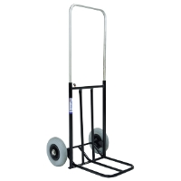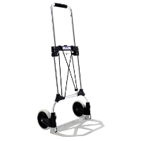 Lätt bagagekärra, tillverkad i aluminium, plast och plåt. Genialisk konstruktion som gör att handtag, hjul och lastplattform fälls ut och in samtidigt. Höjdläget på handtaget kan låsas steglöst från helt nerfällt till helt uppfällt. Försedd med kullagrade, punkteringsfria hjul. Höjd uppfälld: 990 mm, Höjd hopfälld: 720 mm, Bredd: 490 mm, Tjocklek hopfälld: 60 mm, Lastplatsens djup: 235 mm, Hjuldiam: 175 mm.