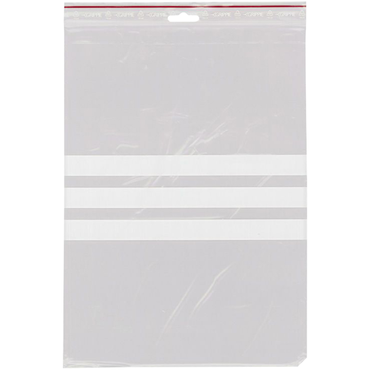 Zip-Påsar Transparenta från GRIPPIE med tre vita skrivfält som gör det enkelt att märka innehållet direkt på påsen. Även utrustade med ett 5mm ovalt eurohål för smidig upphängning.